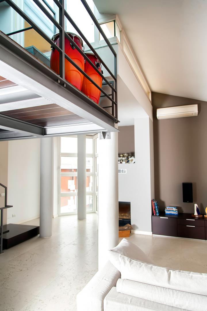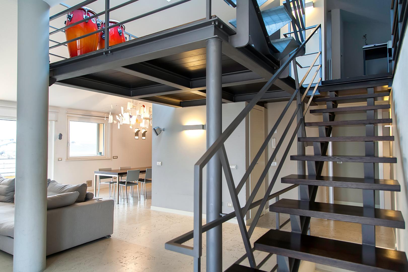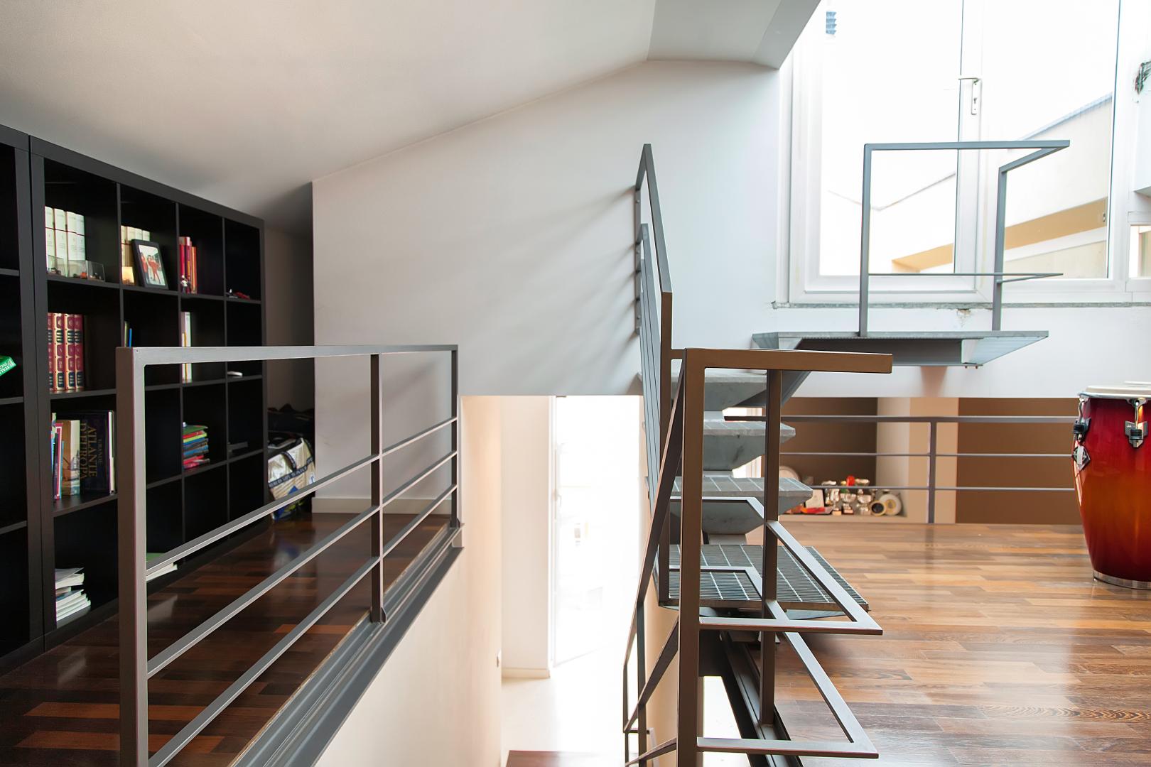 La struttura del soppalco è realizzata in ferro e non nasconde le strutture semplice della carpenteria in ferro.