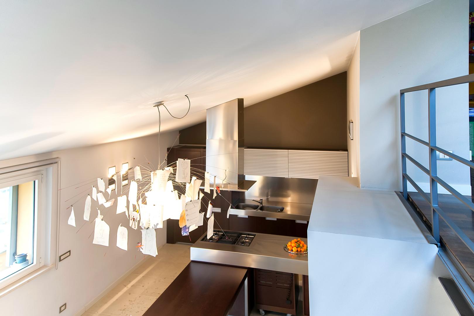 Importante è la luce che entra oltre che dalle finestre anche dalla veranda posta sul tetto, la luce si riflette sulla pavimentazione in marmo biancone utilizzato anche per la scala e per il rivestimento dei bagni.