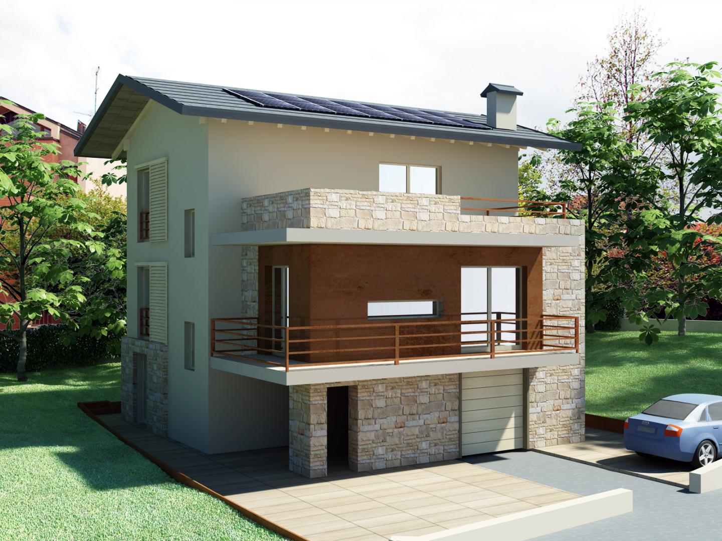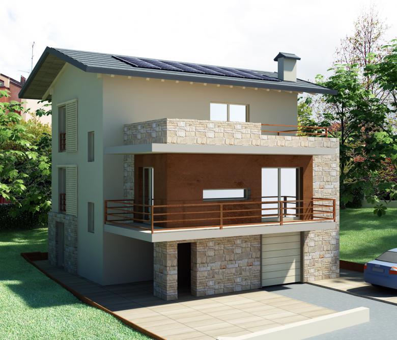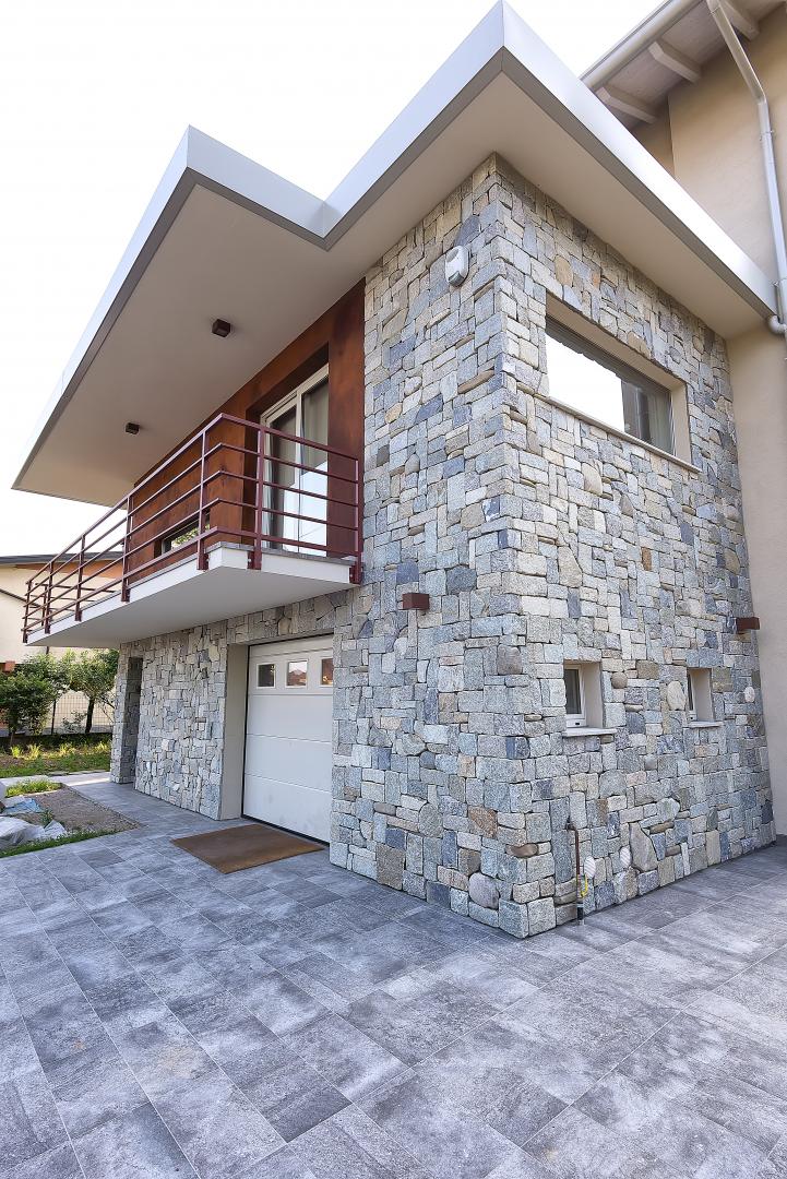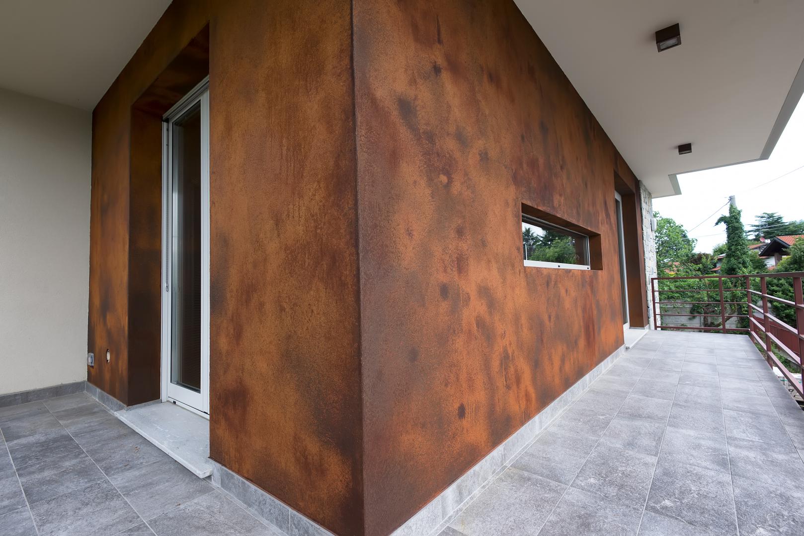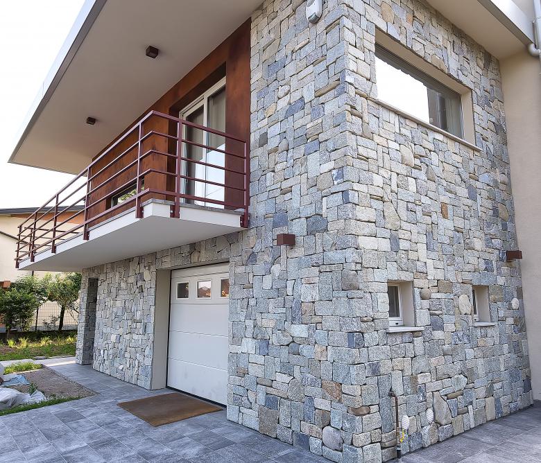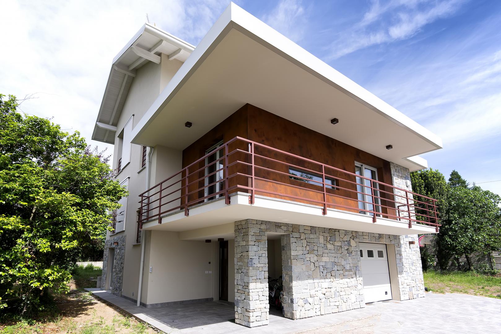 Ristrutturazione di una casa anni ’50 attraverso l’uso del colore e dei materiali: la pietra a spacco ad interrompere la verticalità, le tonalità neutre dei panna, l’ardesia scura sul tetto, e gli accenti di colore in corten.