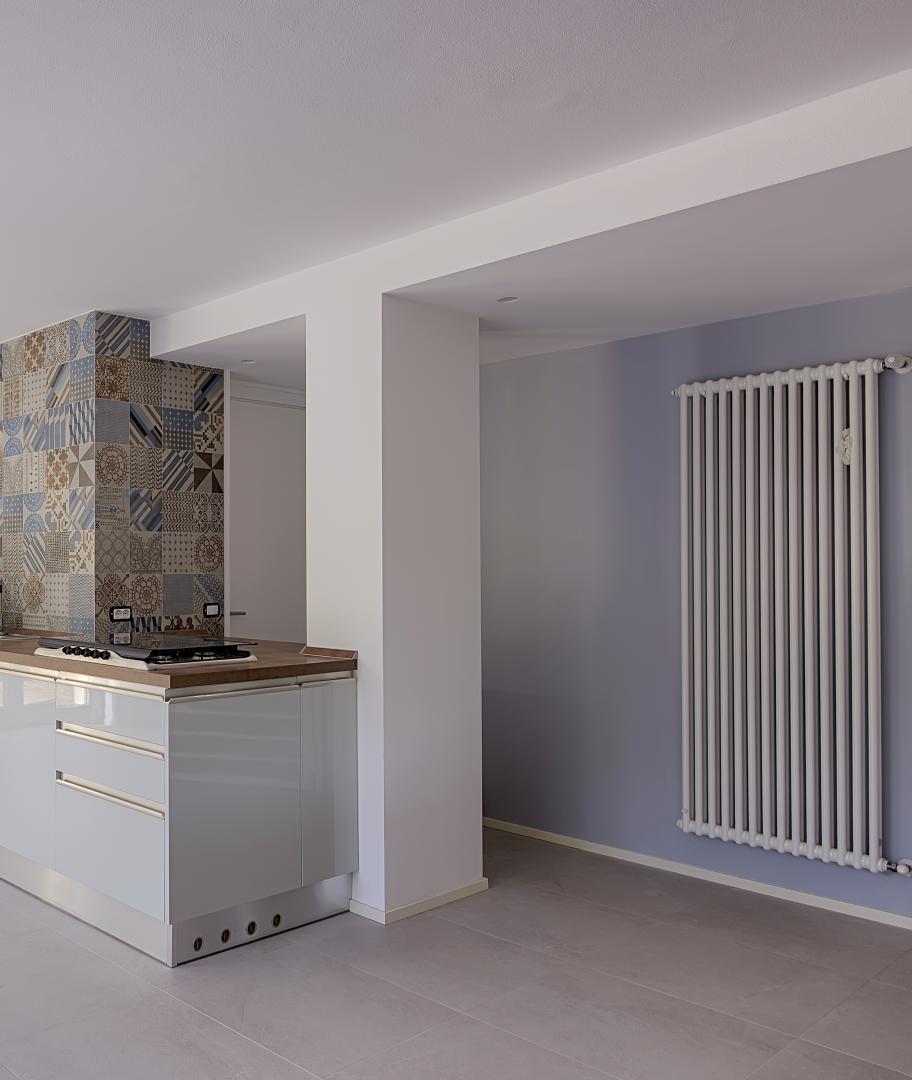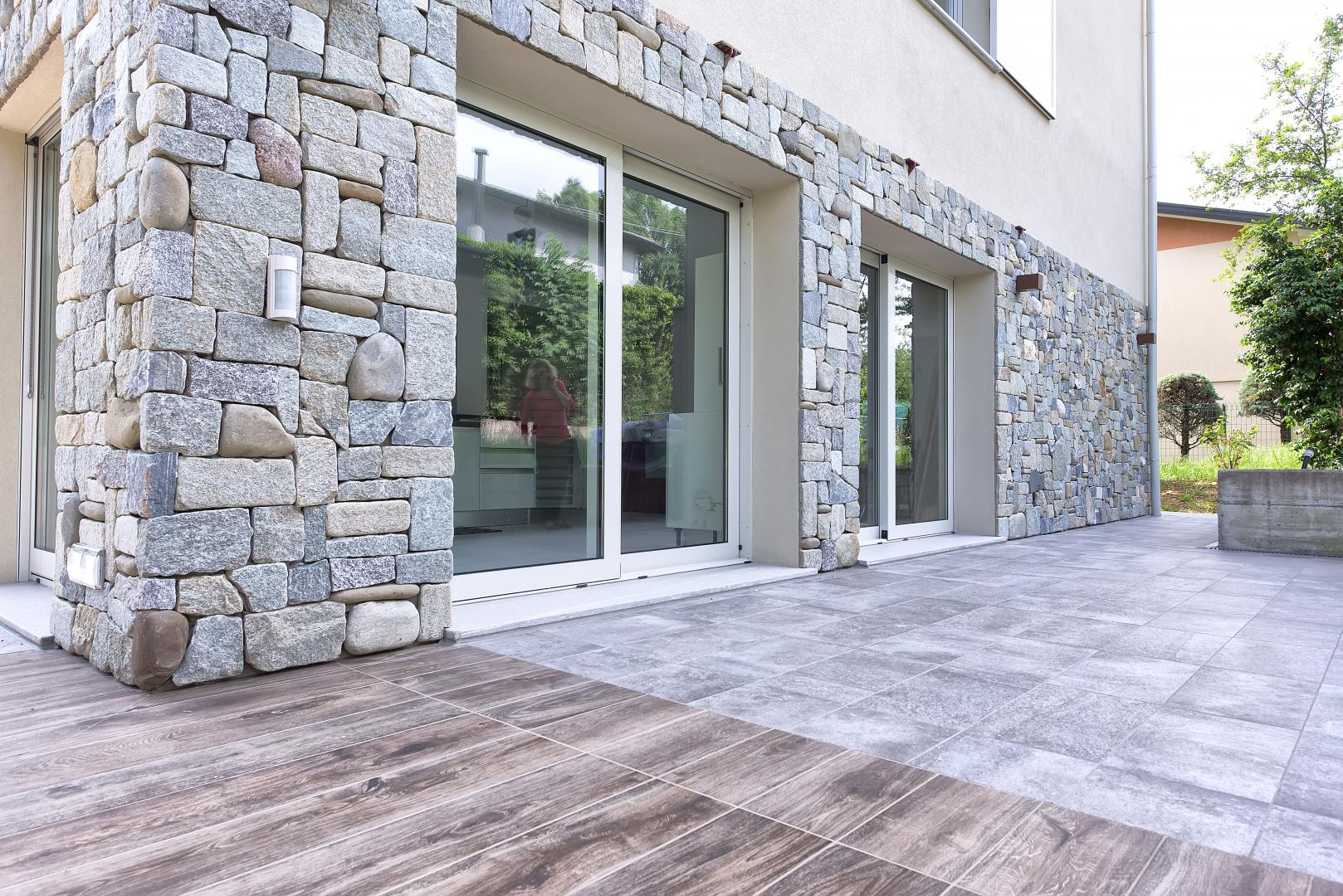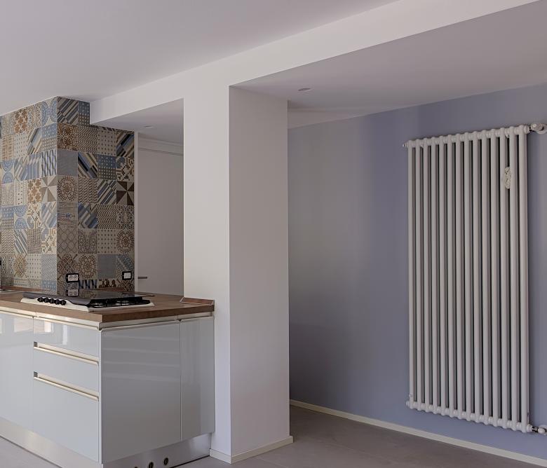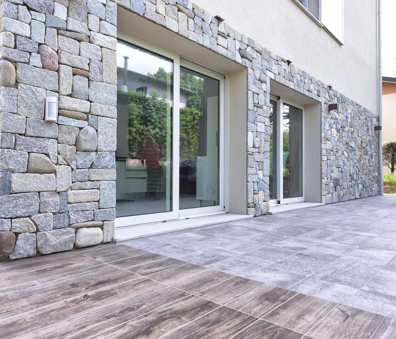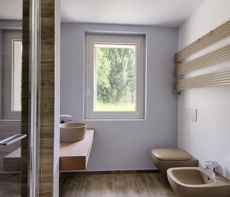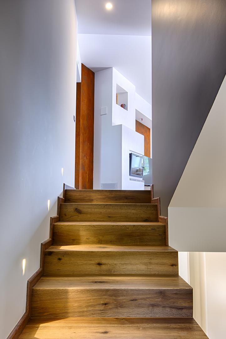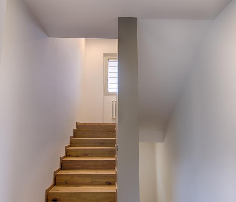 Ristrutturazione di una casa anni ’50 attraverso l’uso del colore e dei materiali: la pietra a spacco ad interrompere la verticalità, le tonalità neutre dei panna, l’ardesia scura sul tetto, e gli accenti di colore in corten.