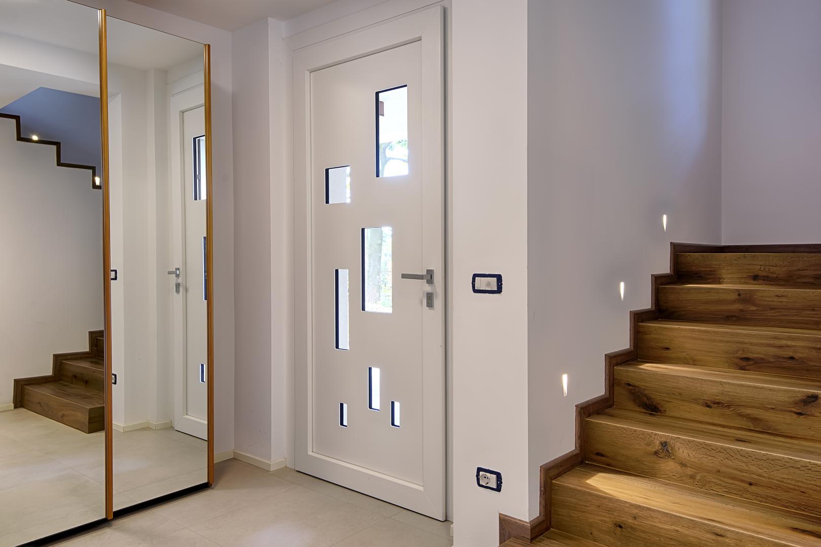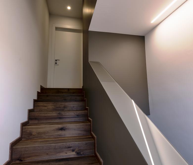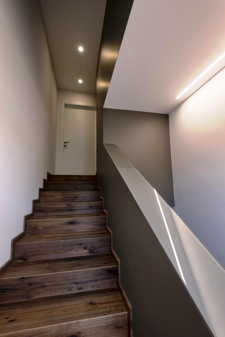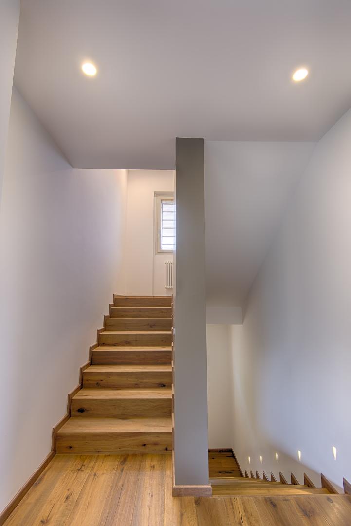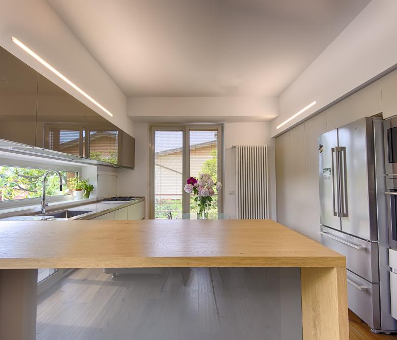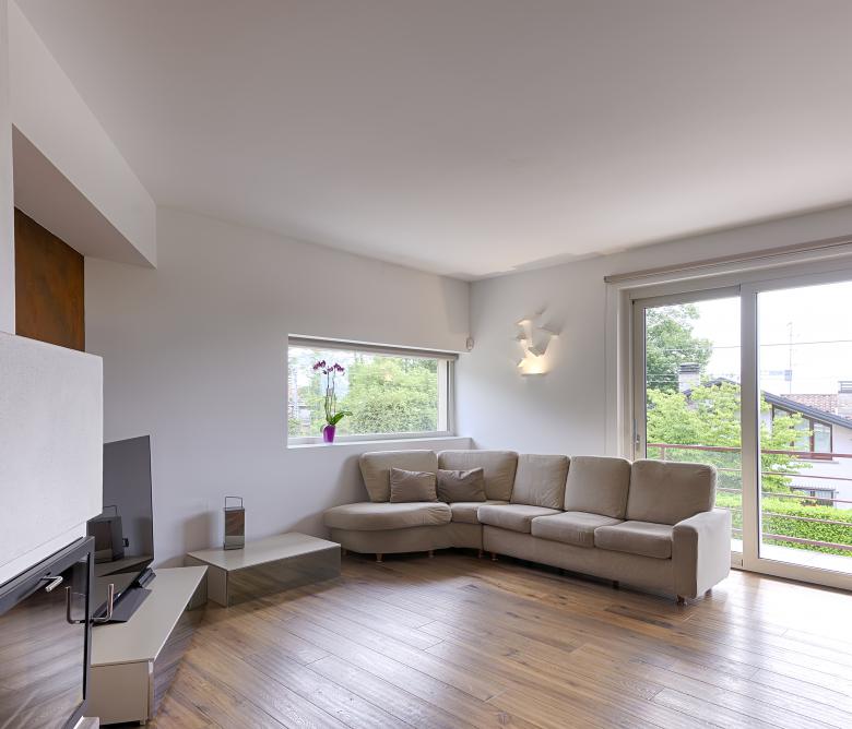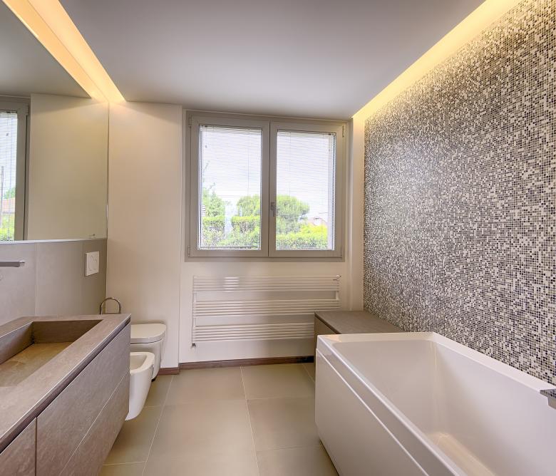 Ristrutturazione di una casa anni ’50 attraverso l’uso del colore e dei materiali: la pietra a spacco ad interrompere la verticalità, le tonalità neutre dei panna, l’ardesia scura sul tetto, e gli accenti di colore in corten.
