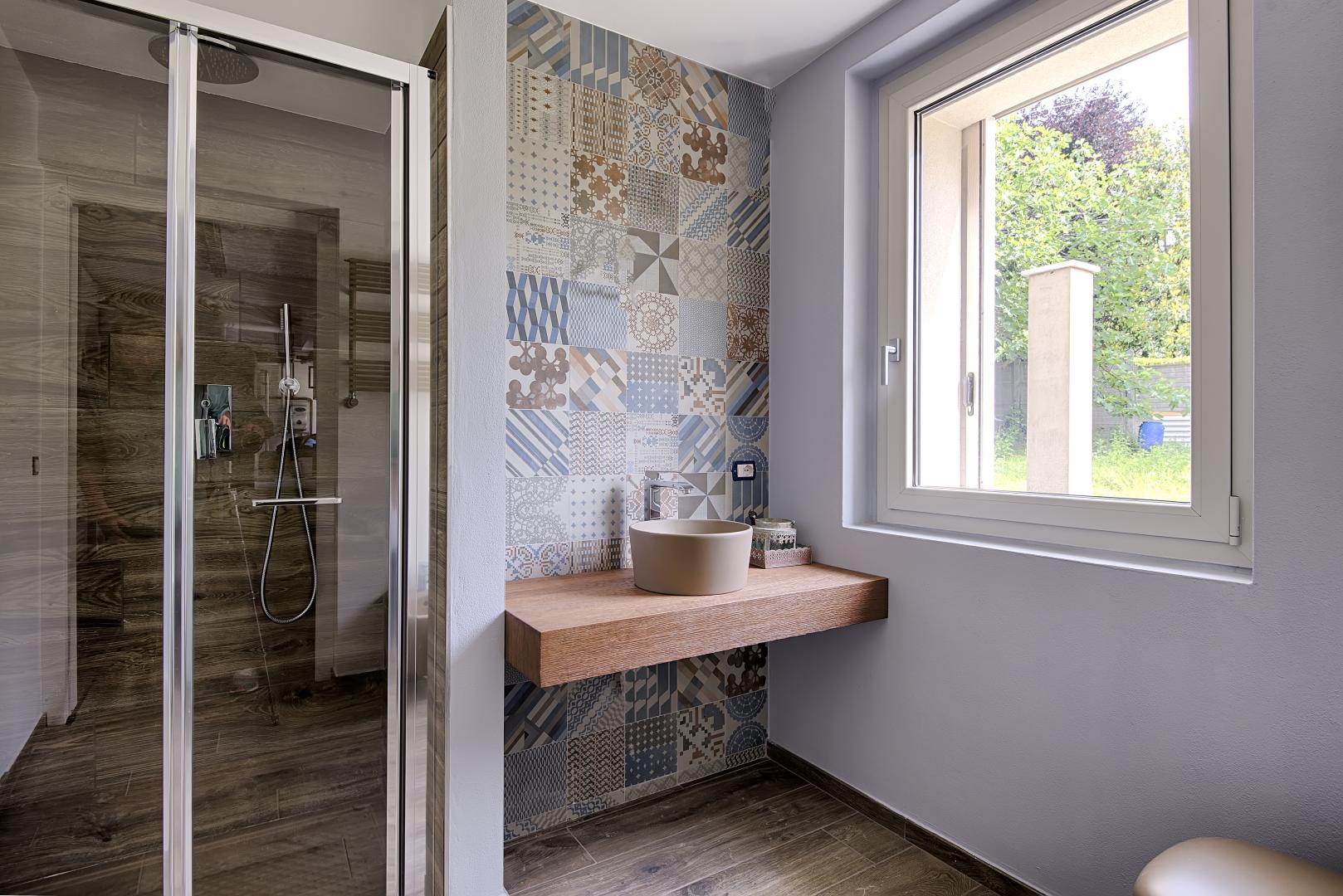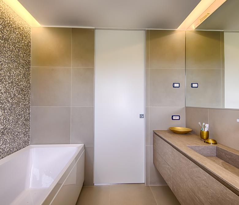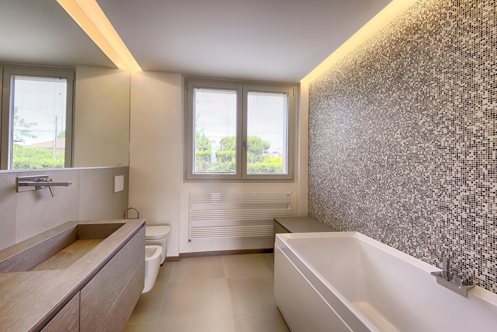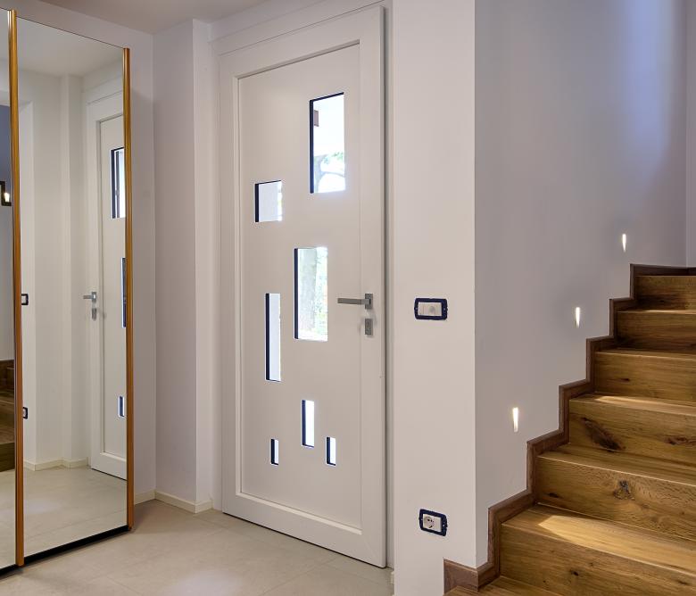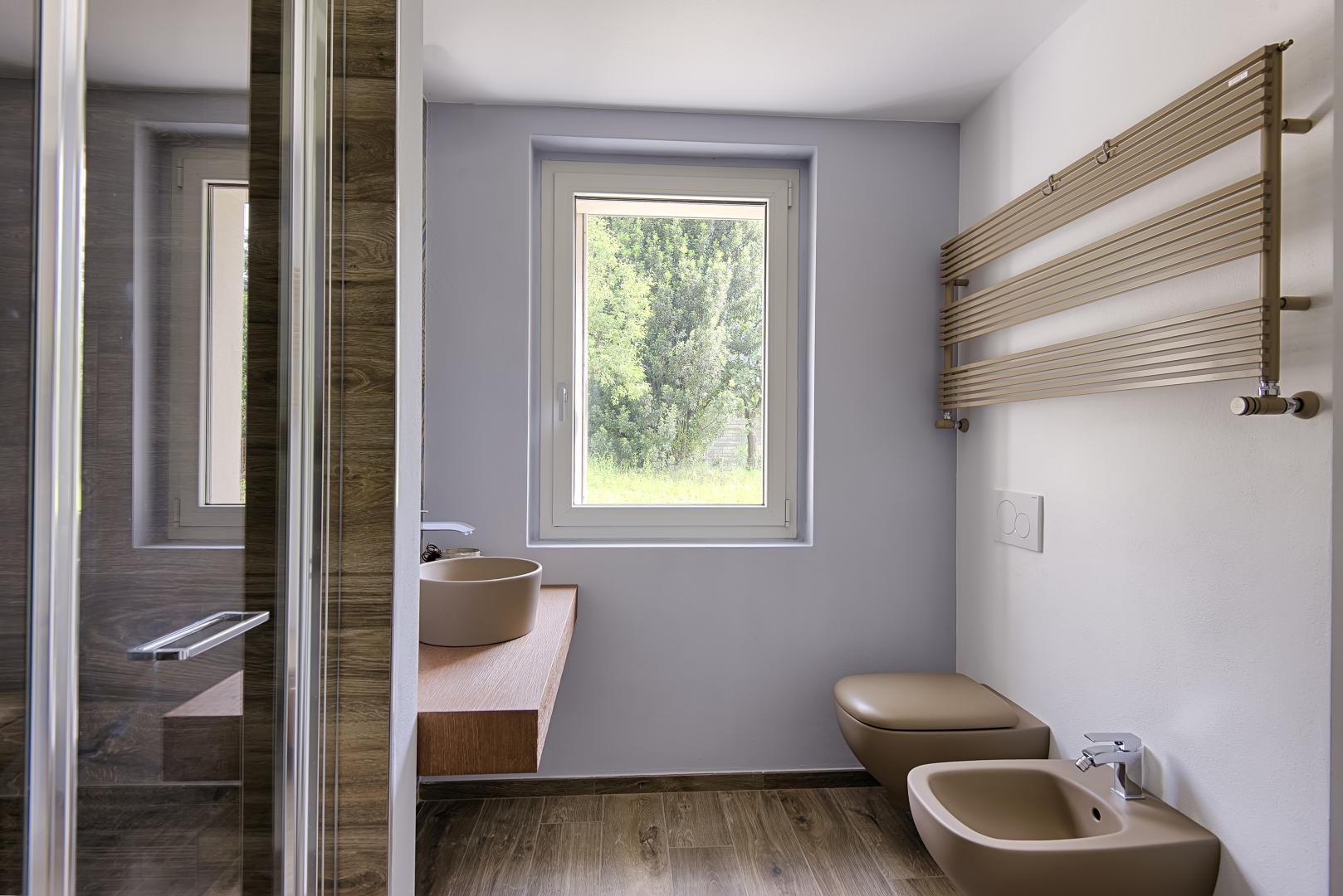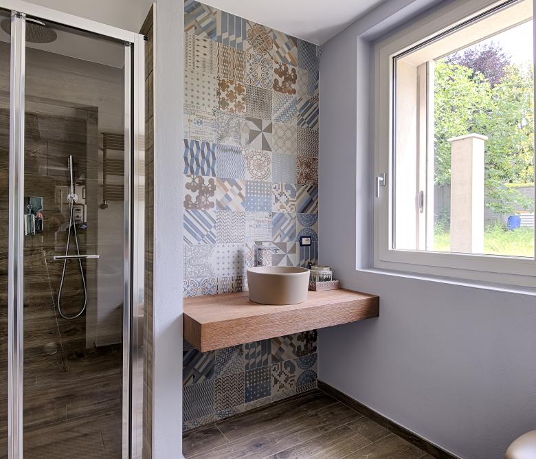 Ristrutturazione di una casa anni ’50 attraverso l’uso del colore e dei materiali: la pietra a spacco ad interrompere la verticalità, le tonalità neutre dei panna, l’ardesia scura sul tetto, e gli accenti di colore in corten.